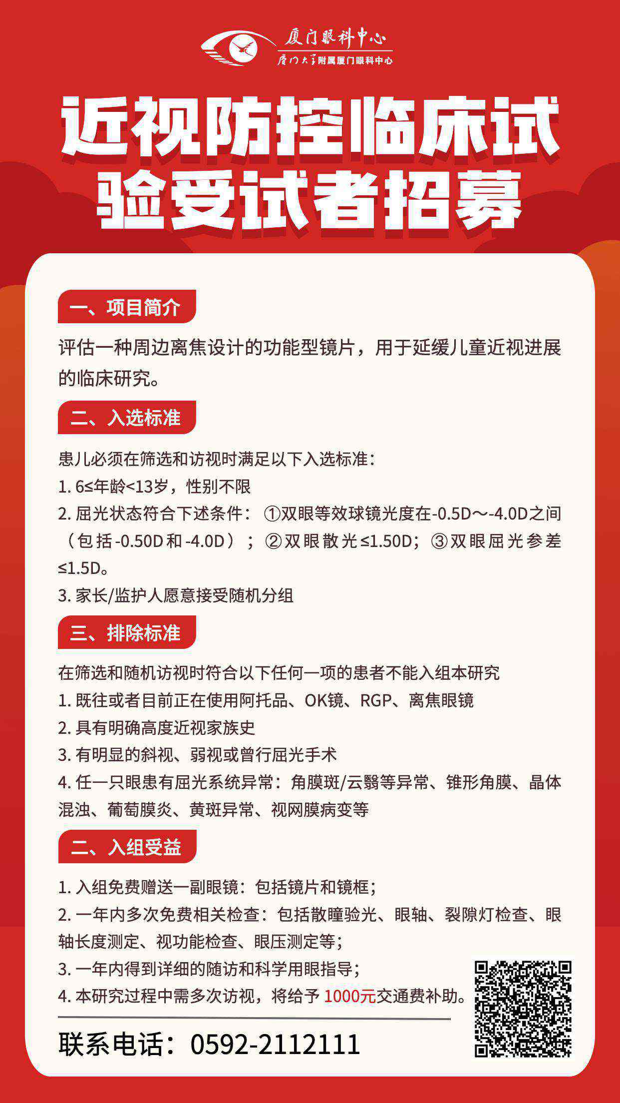 本次研究對受試者的個人信息將嚴格保密,所獲的所有信息將僅作研究分析之用。如果有可能符合以上條件或想了解更多信息的朋友,可以通過以下方式咨詢:0592-2112111