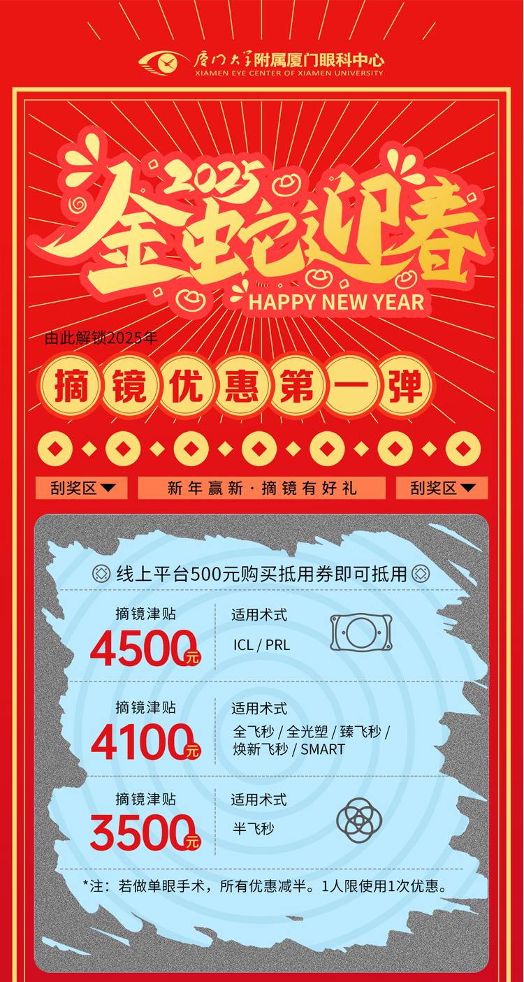 線上平臺500元購買抵用券,ICL、PRL可抵用4500元摘鏡津貼,全飛秒/全光塑/臻飛秒/煥新飛秒/SMART可抵用4100元摘鏡津貼,半飛秒可抵用3500元摘鏡津貼。