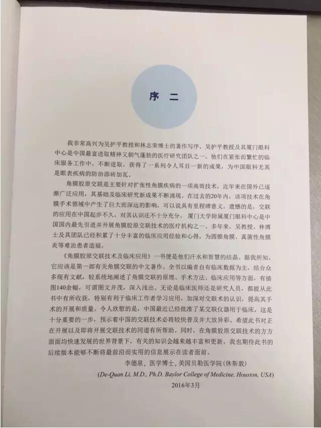 美國貝勒醫(yī)學院李德泉醫(yī)學博士說:“據(jù)我所知,它應該是頭一部有關角膜交聯(lián)的中文著作。”