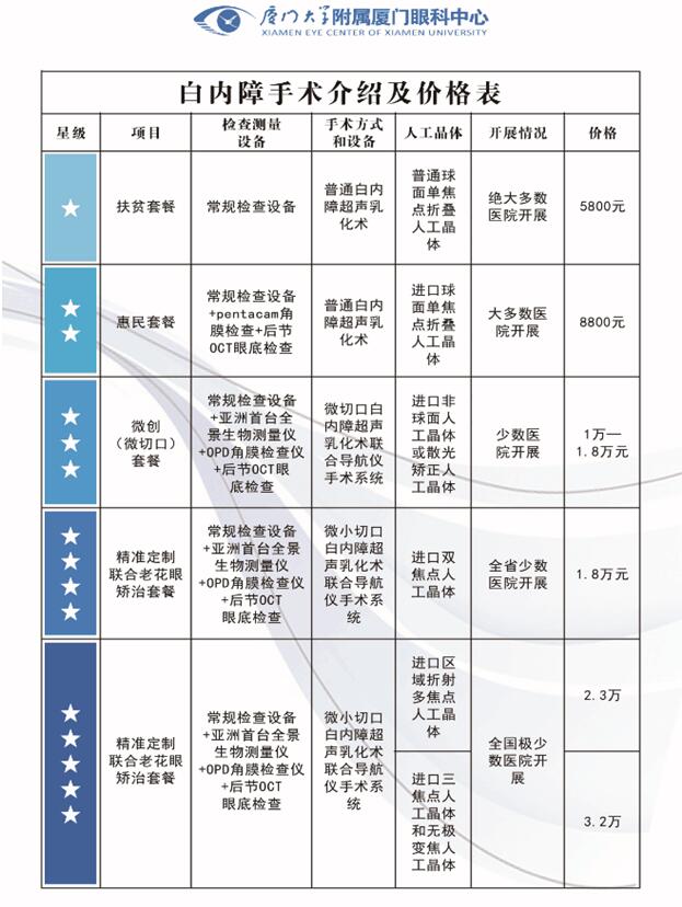 為最大程度滿足患者的個性化需求,眼科中心在原有套餐的基礎上,更加精細化,根據(jù)手術方式、人工晶體的品牌、材質及手術耗品等不同,推出六大白內障手術套餐價,使眼病患者享受指定服務,放心就醫(yī),明白消費。