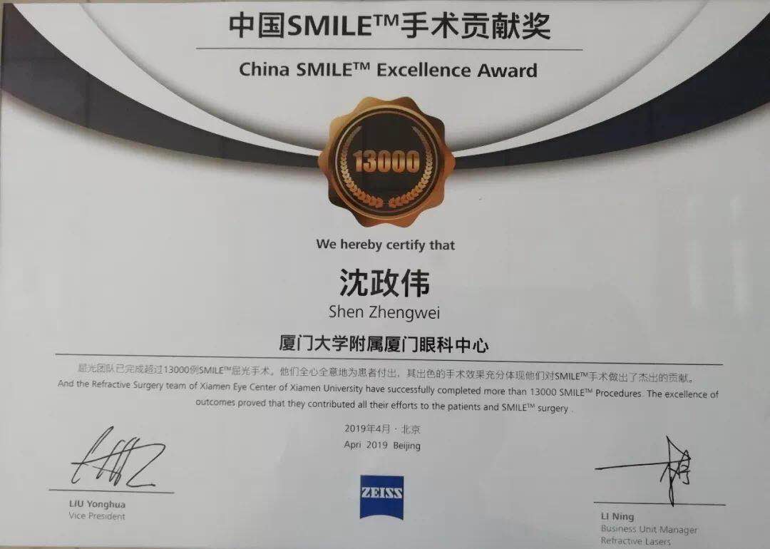 沈政偉院長榮獲“中國SMILE™手術(shù)貢獻(xiàn)獎”