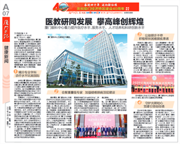 恰逢廈門經(jīng)濟特區(qū)隆重慶祝建設(shè)40周年,乘著改革開放的東風,廈門眼科中心與特區(qū)同頻共振,著力提升醫(yī)療水平、服務(wù)水平、人才培養(yǎng)及科研創(chuàng)新水平。廈門日報、廈門晚報、海西晨報、海峽導(dǎo)報等媒體進行專題報道。